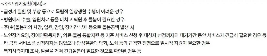 - 갑작스러운 질병, 수술, 부상 발생, 주돌봄자 부재 등 위기 상황이 발생한 경우