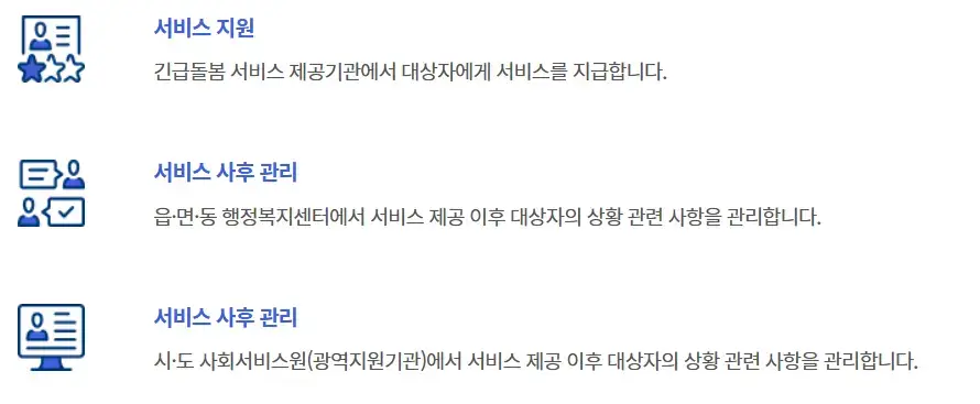 - 일반적 아동 양육, 즉시 개입이 필요한 사고, 자살시도, 학대사례, 자연재난 등으로 거주가 불안정한 경우 등