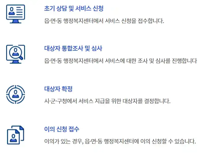 - 대상자의 가정을 방문해 기본 돌봄 서비스(재가 돌봄, 가사, 이동 지원) 및 방문목욕 서비스 제공